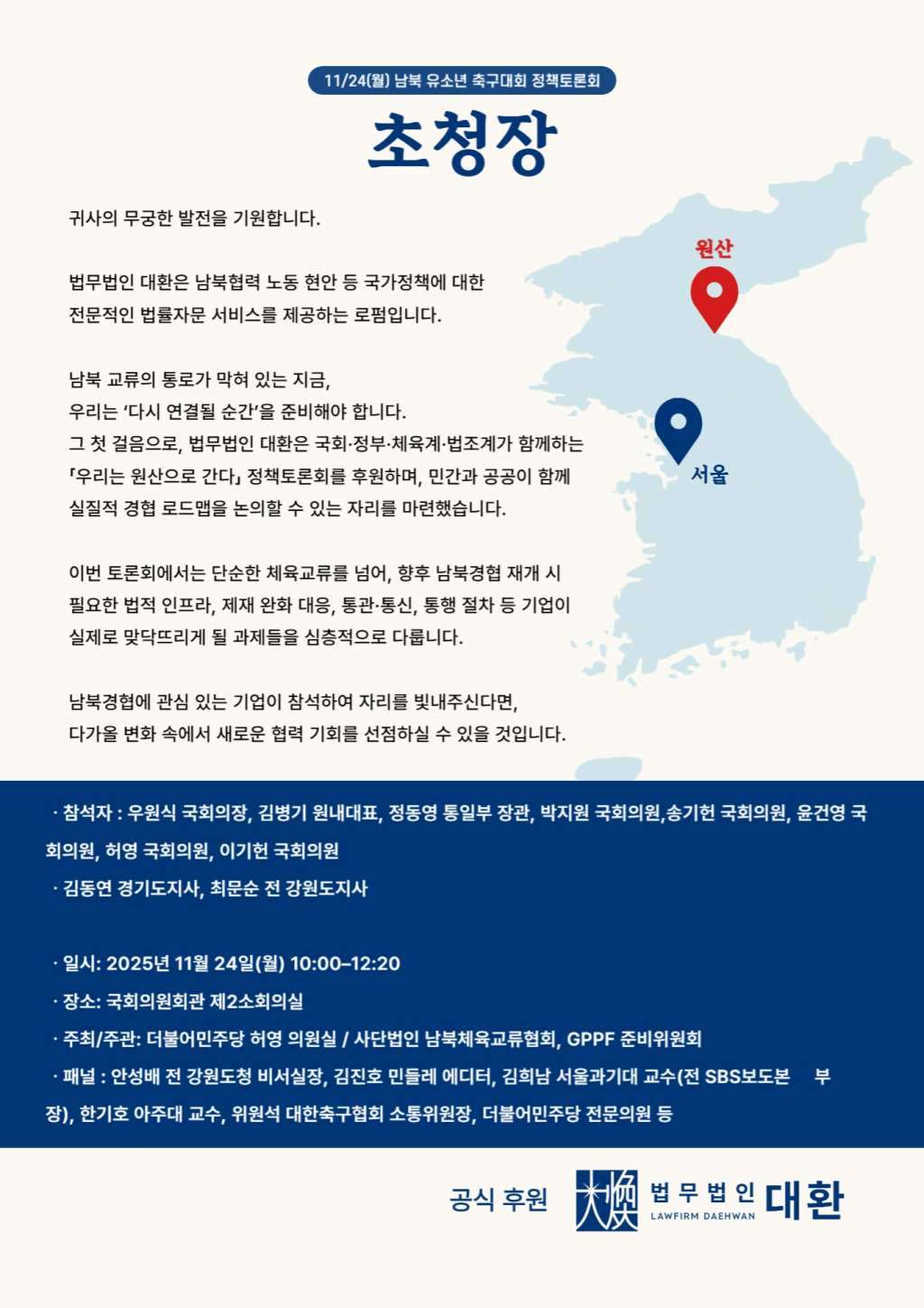 국회에서 지난 24일 남북 문화·스포츠 협력 활성화를 주제로 한 토론회가 열렸다. 참석자로는 우원식 국회의장, 박지원 전 국정원장, 송기헌·서영교·윤건영·윤종근·이기헌·허영·노정면 의원 등이 자리했다. 축전은 정동영 전 통일부 장관, 김동연 경기도지사, 김병기 민주당 원내대표가 전달했다. 이번 행사는 국회가 주최하고 법무법인 대환이 공식 후원사로 참여하여, 행사 준비와 실무 협력 등 다양한 영역에서 지원을 제공했다. 김익환 법무법인 대환 총괄대표는 “남북 스포츠·문화·예술 교류는 한반도의 지속 가능한 협력 구조를 만드는 중요한 과제다. 법무법인 대환은 관련 사업들이 제도적으로 뒷받침될 수 있도록 법률·정책 기반을 마련하는 데 적극적으로 참여하겠다”라고 밝혔다. 법무법인 대환은 향후 남북 스포츠 교류 준비, 문화·예술 프로그램 자문, 공공 협력사업 등에서 실질적인 법률 지원을 이어갈 예정이다. 기사 원문보기 : https://www.wowtv.co.kr/NewsCenter/News/Read?articleId=A202511250429&t=NN